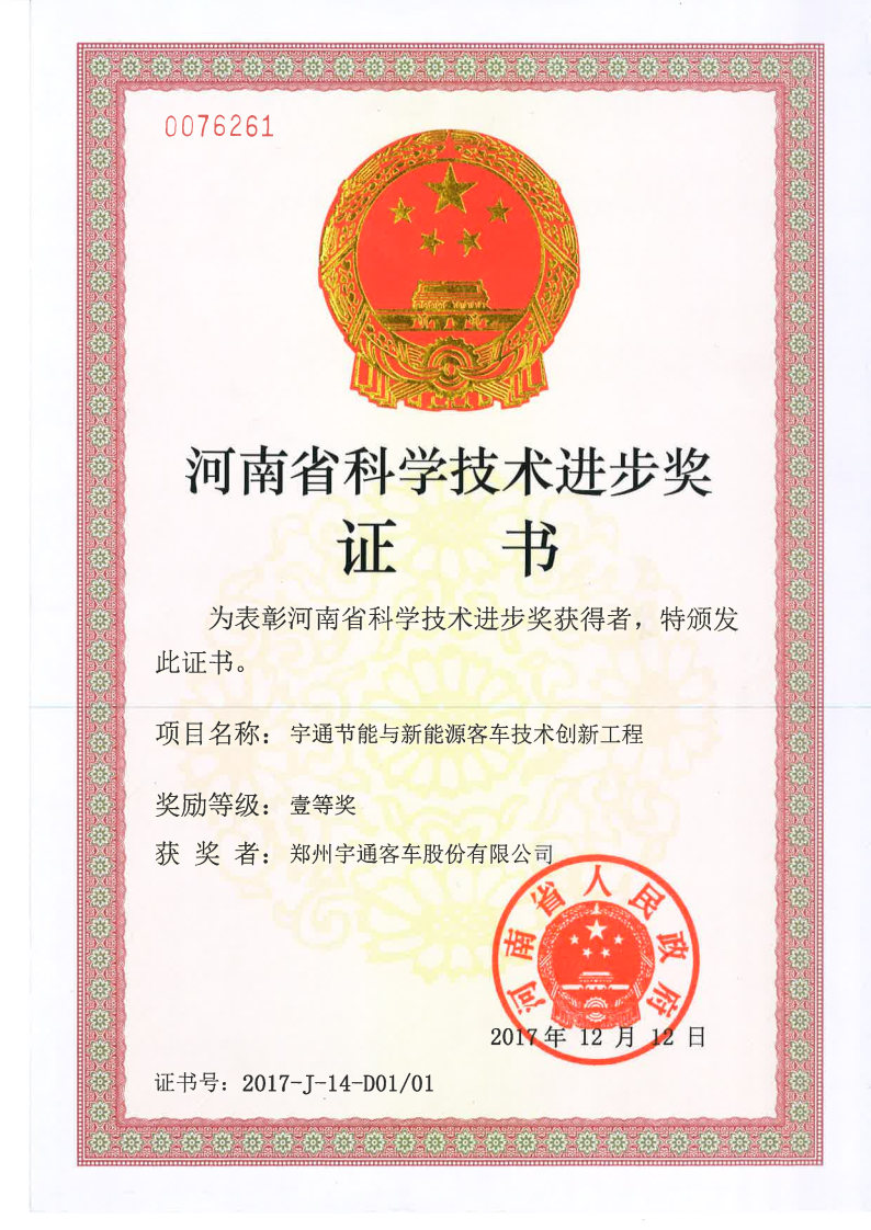 2017年“宇通节能与新能源客车技术创新工程”荣获"河南省科技进步一等奖"