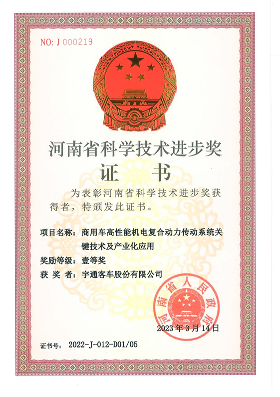 2013年“混合动力电动客车关键技术研发及系列化产品应用”荣获"河南省科技进步一等奖"